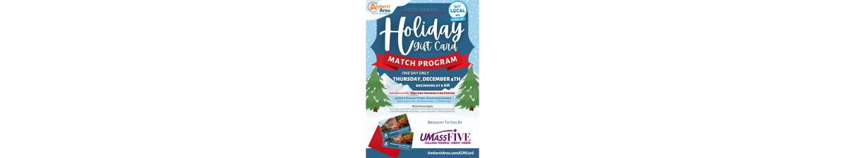 Join us for our Fifth Annual Gift Card Match Day! Purchase a $25 Amherst Area Gift Card with a small $1 processing fee. For every card purchased, the Chamber will provide a gift card with a value of $50, effectively doubling the shopping power. Thank you to our sponsor, UMassFive College Federal Credit Union, for making this Match Day possible and supporting small business!